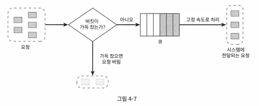 누출 버킷 알고리즘은 토큰 버킷 알고리즘과 비슷하지만 FIFO 큐를 통해 요청 처리율을 고정했다는 점이 다르다. 전자상거래 기업인 쇼피파이(Shopify)가 이 알고리즘을 사용하여 처리율을 제한하고 있다. 동작원리는 다음과 같다.