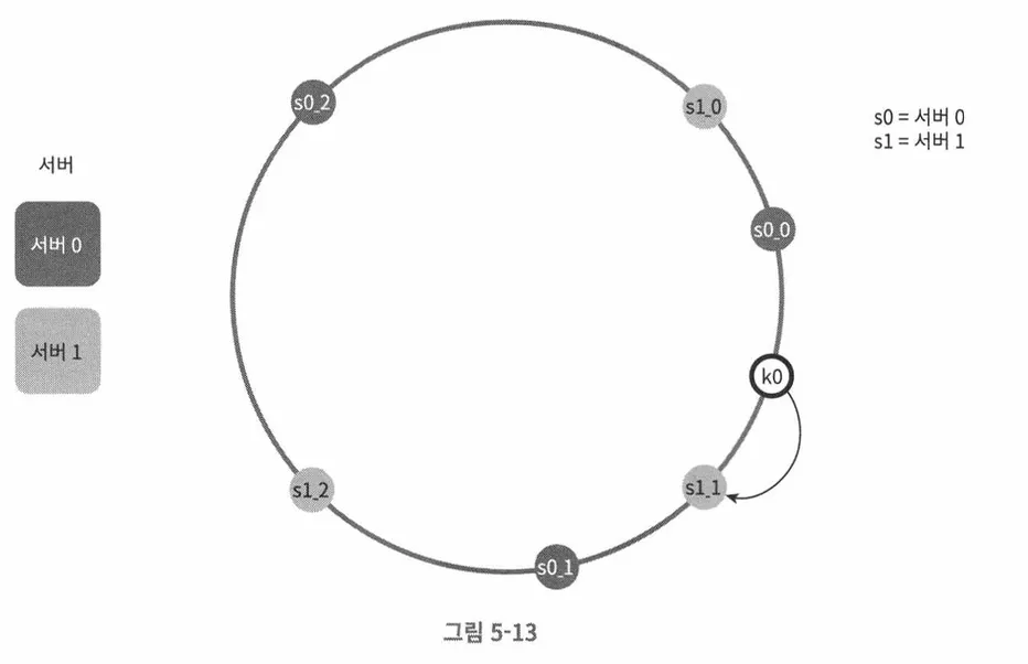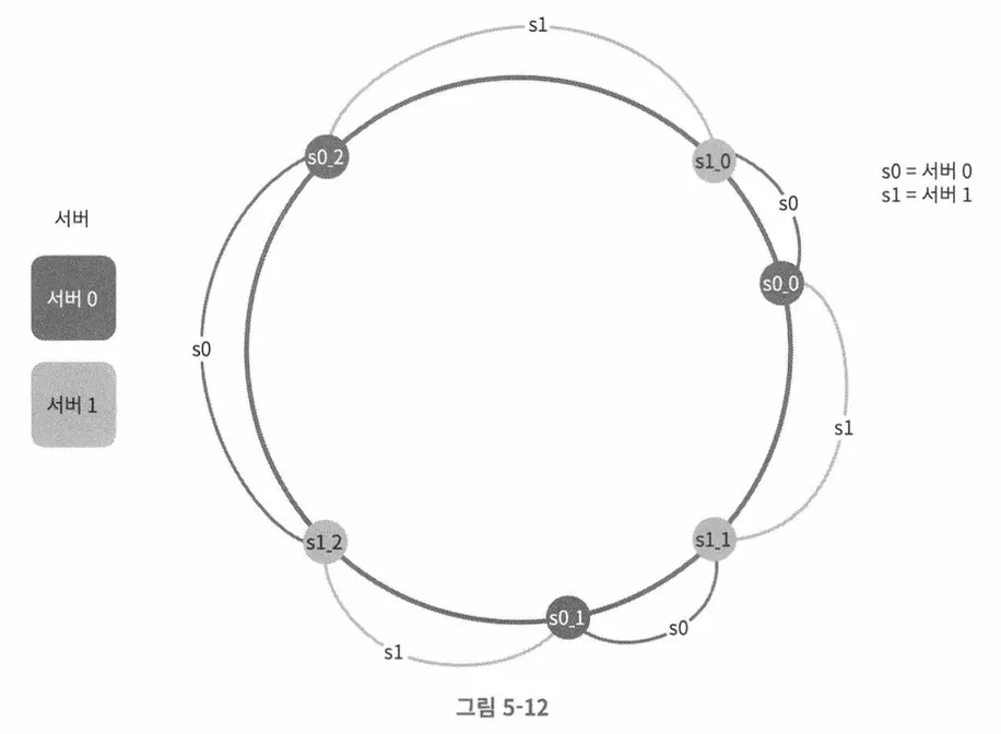 가상 노드는 실제 노드 혹은 서버를 가리키는 노드로서, 하나의 서버는 링 위에 여러 가상 노드를 가질 수 있다.