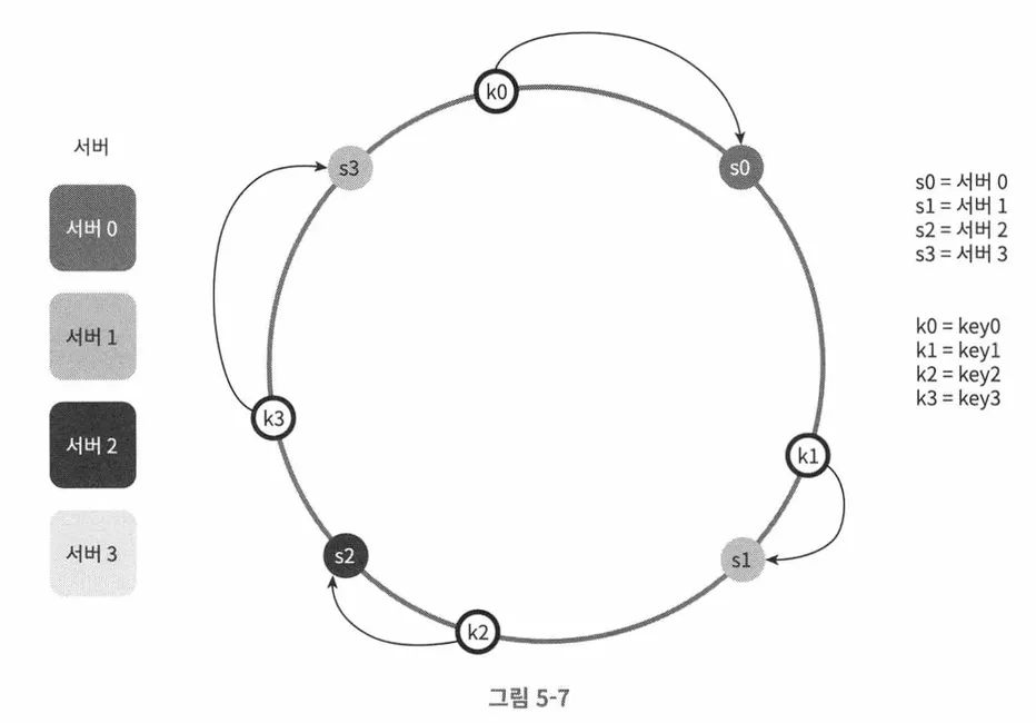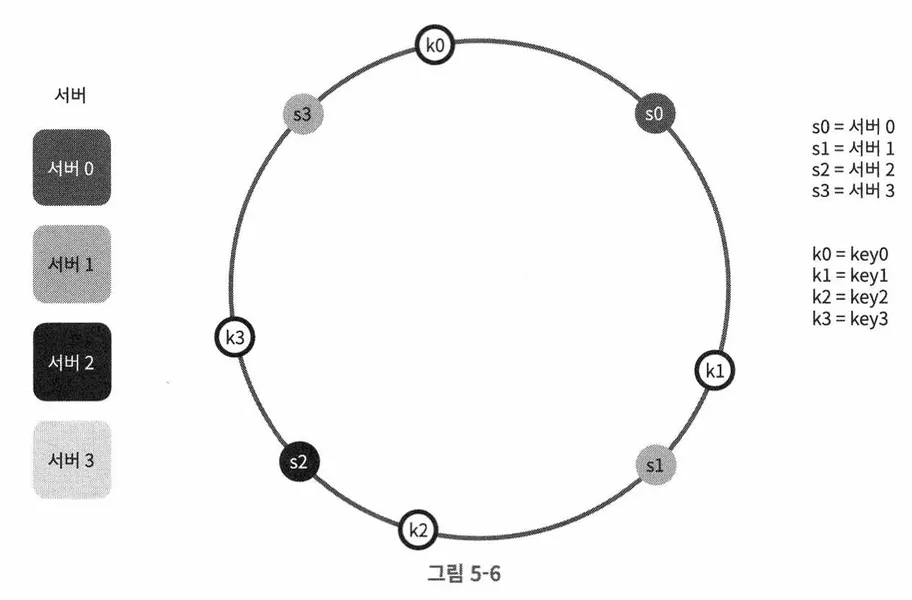 안정 해시는 서버와 키를 균등 분포 해시 함수를 사용해 해시 링에 배치하고, 키의 위치에서 링을 시계 방향으로 탐색할 때 만나는 가장 첫 서버에 키를 저장하는 방식이다.
