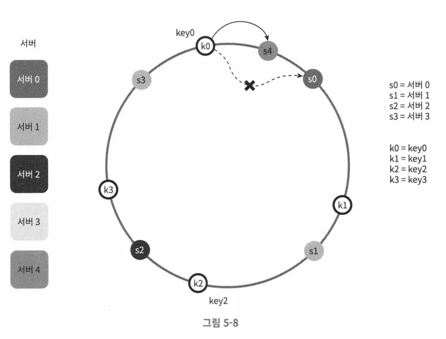 만약 s4라는 새로운 서버가 추가된다면, 해시 링 위의 키들 중 일부만 재배치 하면 된다.