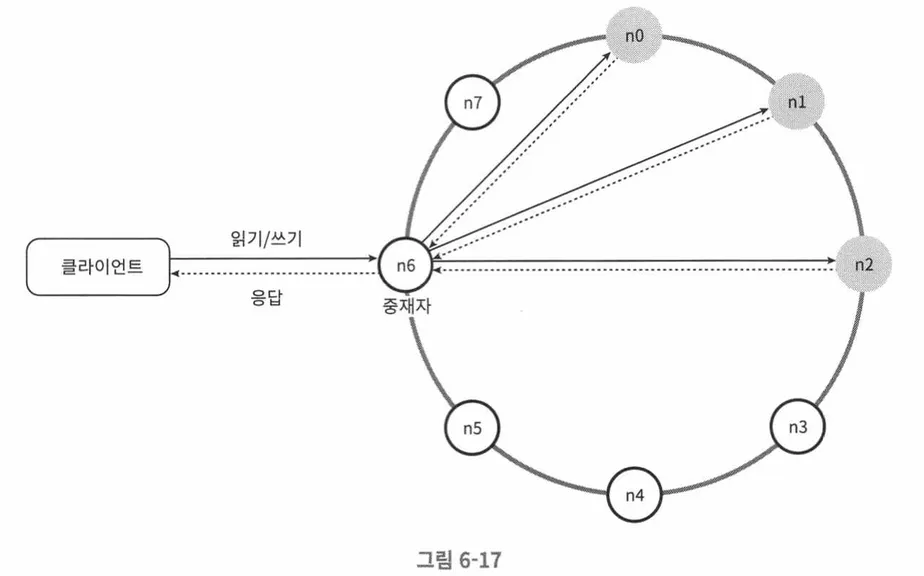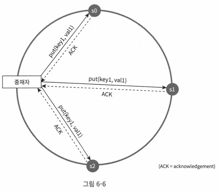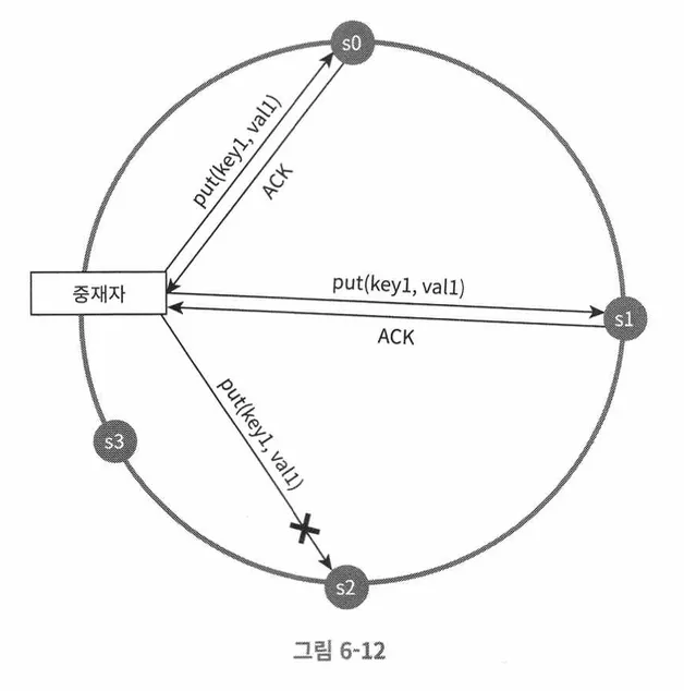 W = 1의 의미는 데이터가 한 대의 서버에만 기록된다는 것이 아니고, 중재자가 서버 중 쓰기 연산이 성공했다는 응답을 최소 한 개 이상 받아야 쓰기 연산에 성공했다고 판단한다는 의미이다. 중재자는 s1에서 성공 응답을 받으면 s0과 s2에서 응답을 기다릴 필요가 없다. 이처럼 중재자는 클라이언트와 노드 사이에서 프록시 역할을 한다.