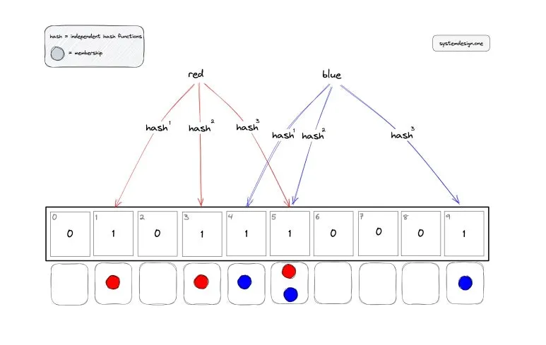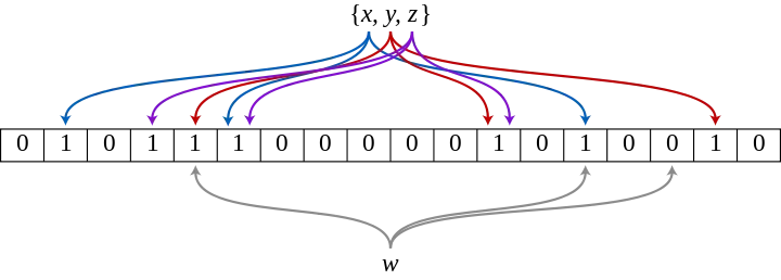 반데로 데이터를 찾을 때는 모든 해시 값들의 값이 1인지 확인한다. 모든 값이 1이더라도 반드시 존재한다는 의미가 아니라 있을수도 있다는 점을 주의하자.