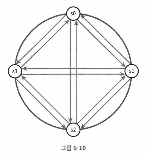 위 그림처럼 모든 노드 사이에 멀티캐스팅 채널을 구축하는 것이 서버 장애를 감지하는 가장 손쉬운 방법이다. 하지만 이 방식은 서버가 많아진다면 비효율적이기 때문에, 가십 프로토콜(gossip protocol)과 같은 분산형 장애 감지 솔루션을 채택하는 것이 효율적이다.