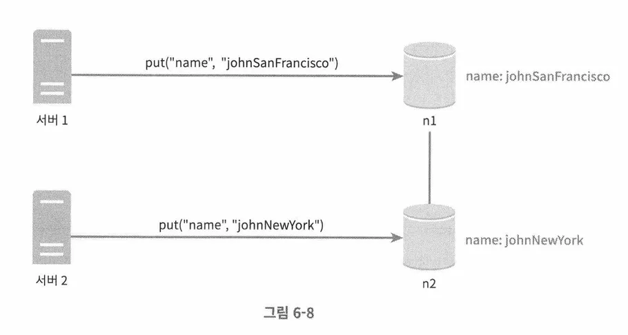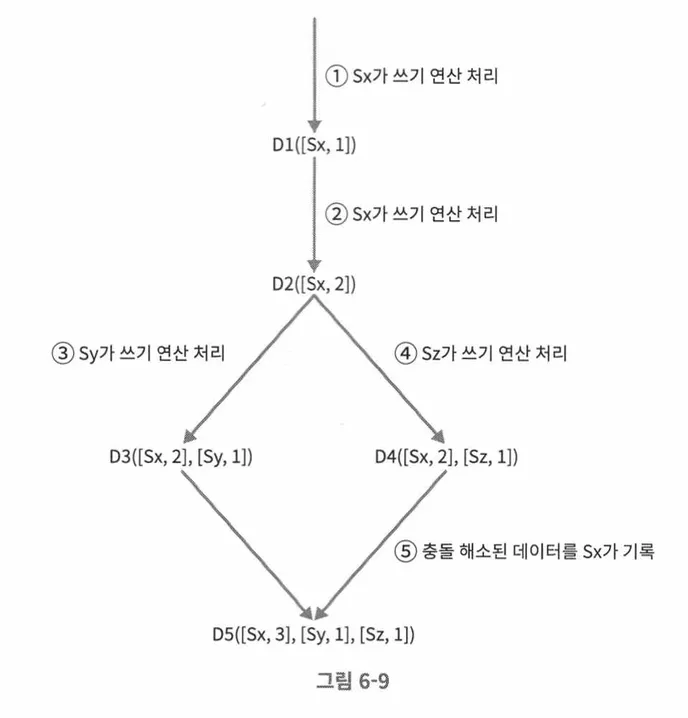 위처럼 각각 다른 서버에서 동시에 수정을 시도한다면 충돌하는 두 값을 갖게 될 것이다. 이 버전을 각각 v1과 v2라고 하면, v1과 v2의 충돌을 발견하고 자동으로 해결해 낼 버저닝 시스템이 필요하다.