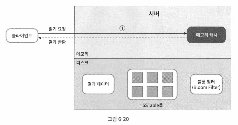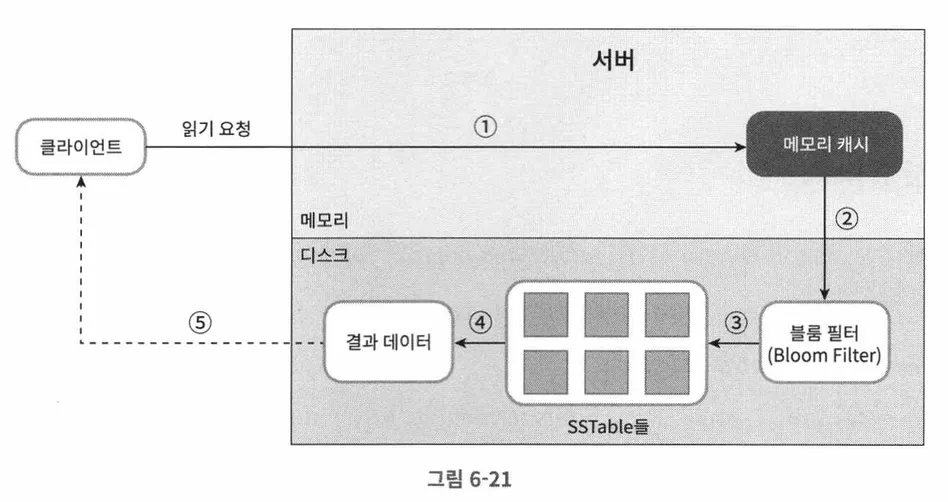 읽기 요청을 받은 노드는 데이터가 메모리 캐시에 있는지 확인 후, 있다면 해당 데이터를 클라이언트에 반환하고 없다면 디스크의 SSTable에서 가져온다. 여기서 어떤 SSTable에 데이터가 존재하는지는 효율적인 방법이 필요한데, 블룸 필터(Bloom filter)가 흔히 사용된다.