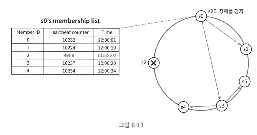 각 노드가 멤버 ID와 박동 카운터(heartbeat count)의 쌍인 멤버십 목록(membership list)를 유지