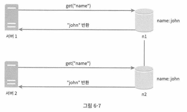 하지만 일관성 대신 가용성을 선택한다면(AP 시스템), 최신화 되지 못한 데이터를 반환하더라도 계속 읽기 연산을 허용한다. 추후 파티션 문제가 해결된 뒤에 새 데이터를 n3에 전달하여 일관성 문제를 해결한다.