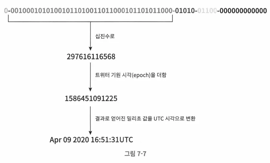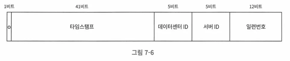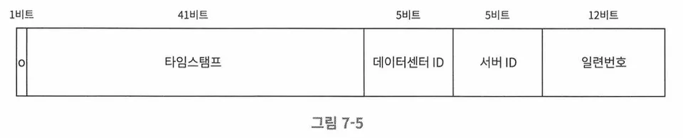 일련번호 : 각 서버에서 ID를 생성할 때 1씩 증가시키는 값을 저장하는 비트로 12비트 할당 (1ms가 경과할 때마다 0으로 초기화)