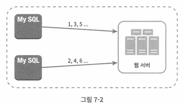 위 그림처럼 서버가 이전에 생성한 이전 ID 값에 전체 서버의 수(2)만큼 증가시켜 다음 ID를 생성한다.