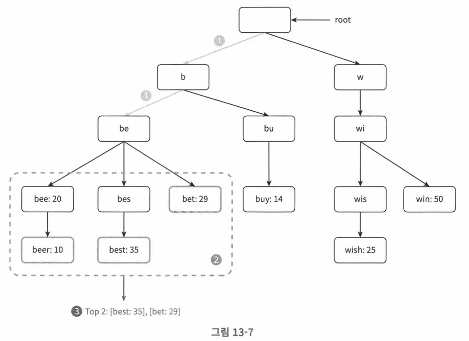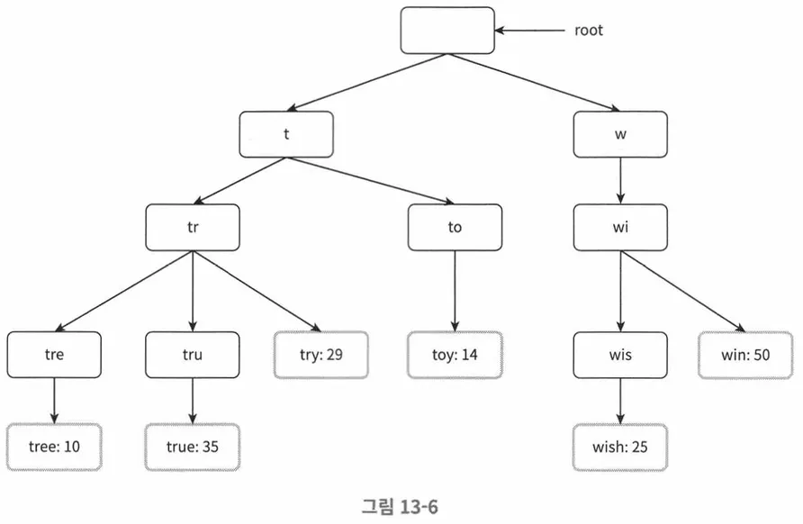 관계형 데이터베이스를 통해 가장 인기 있는 질의문을 골라내는 방안은 효율적이지 않다. 이 문제는 트라이(trie, 접두어 트리)를 통해 해결할 수 있다.