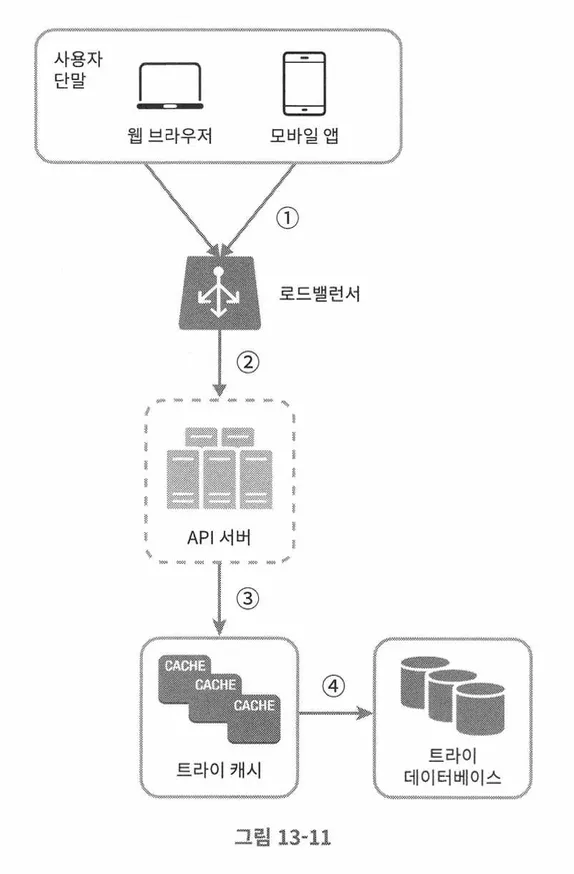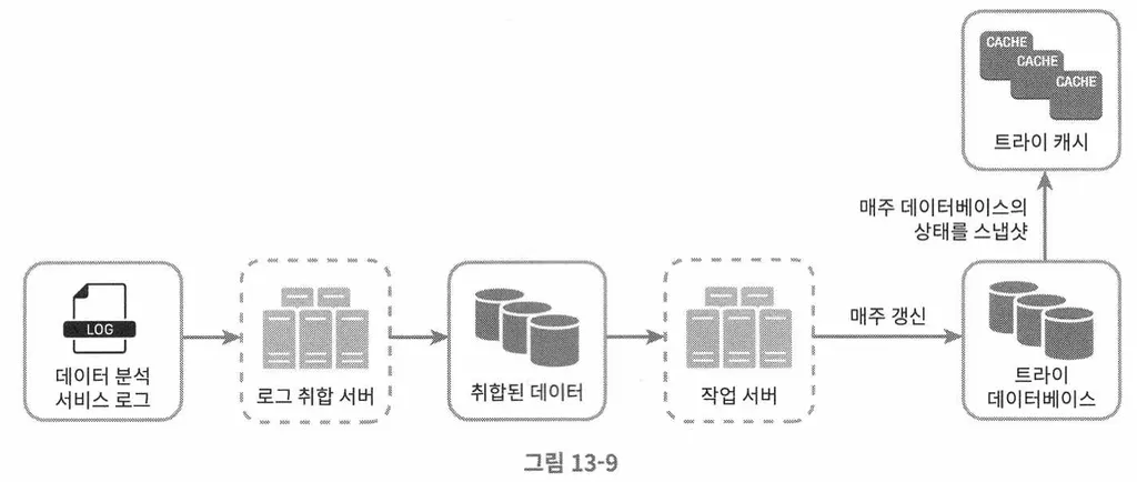 문서 저장소(document storage) : 새 트라이를 매주 만들 것이기 때문에, 주기적으로 트라이를 직렬화하여 데이터베이스에 저장할 수 있다. MongoDB 같은 문서 저장소를 활용해 편리하게 저장할 수 있다.
