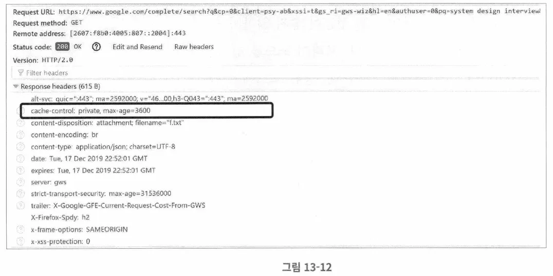 브라우저 캐싱 : 대부분 애플리케이션의 경우 자동완성 검색어 제안 결과는 자주 바뀌지 않는다. 따라서 그 결과를 브라우저 캐시에 넣어두어 최적화 할 수 있다. 구글 검색 엔진이 이런 캐시 메커니즘을 사용한다.(1시간 동안 유지되는 private 캐시로 저장)