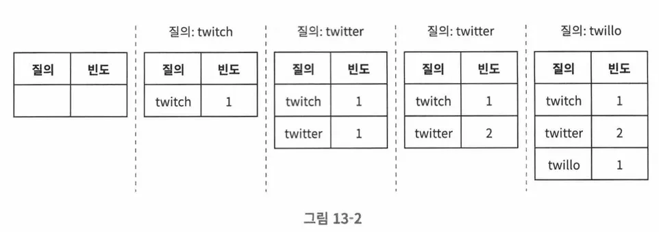 위 그림은 질의문과 사용빈도를 저장하는 frequency table이 있는 상황에서 twitch, twitter, twitter, twilo를 순서대로 검색하면 상태 변화를 나타낸 것이다.