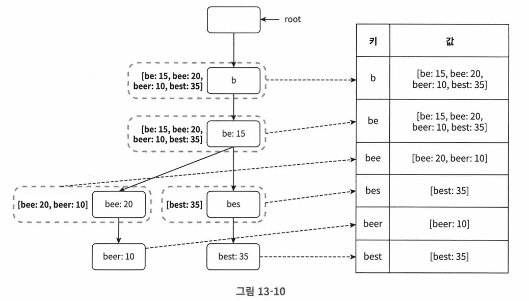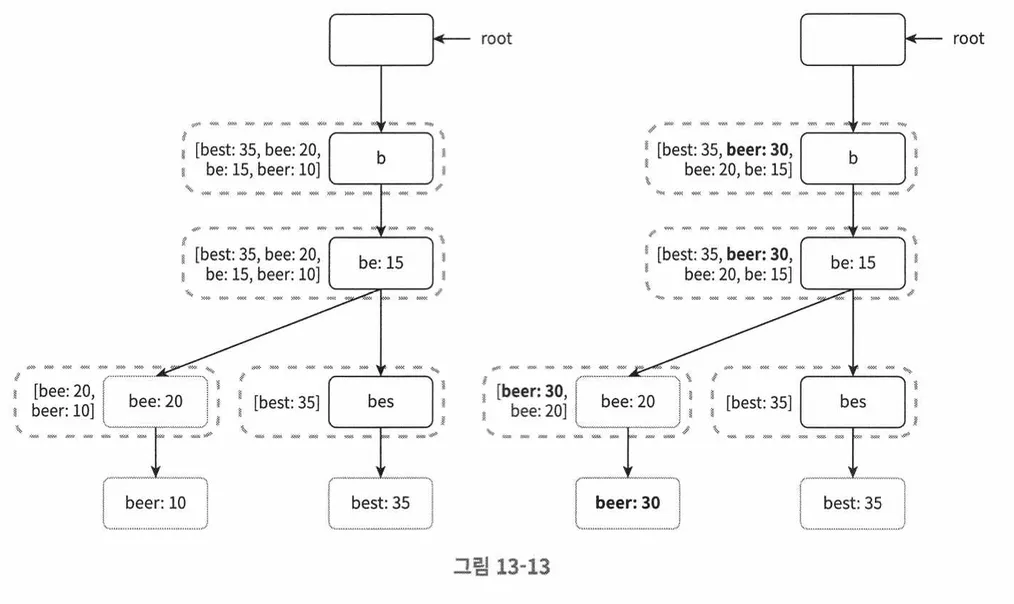 이와 같이 트라이 구조를 개선하면, 각 노드에서 가장 인기 있는 검색어를 찾는 시간 복잡도를 O(1)로 낮출 수 있다.