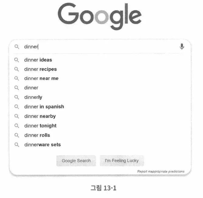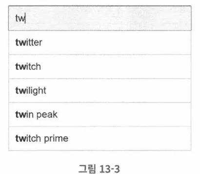 구글 검색이나 아마존 웹 사이트 검색창에 단어를 입력하면 위 글미처럼 글자에 맞는 검색어가 자동으로 완성되어 표시된다. 이러한 검색어 자동완성 시스템을 설계해보자.