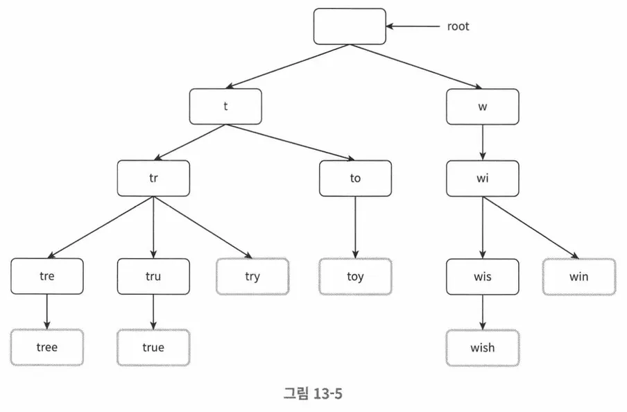각 트리 노드는 하나의 단어 또는 접두어 문자열을 나타낸다.