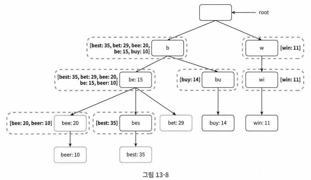 각 노드에 k개의 인기 검색어를 저장해두면 전체 트라이를 검색하는 일을 방지할 수 있다. 5 ~ 10개 정도의 자동완성 제안을 표시하면 충분하기 때문에, k는 작은 값일 것이다.