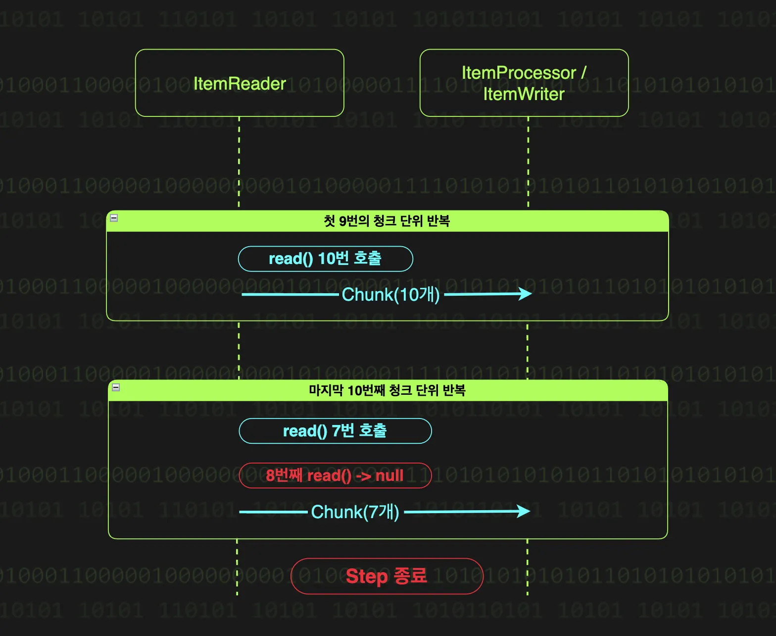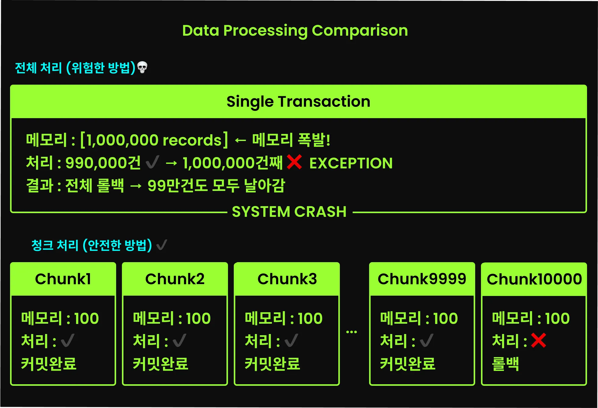 이처럼 RepeatStatus가 필요한 이유는 execute를 반복 실행하기 위해서이고, 반복해서 실행하는 이유는 하나의 거대한 트랜잭션 대신 작은 트랜잭션들로 나누어 안전하게 처리하기 위함이다.