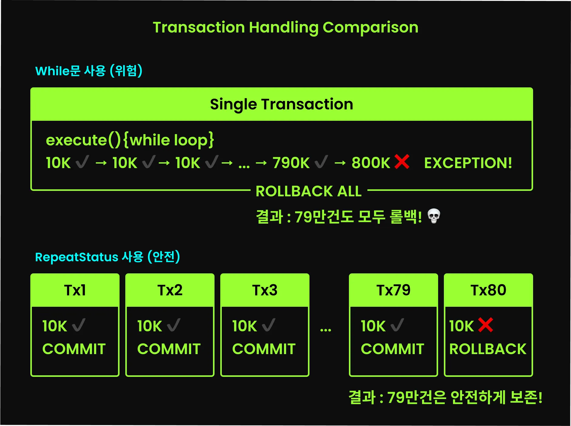 while 문법을 통해 반복 작업을 처리하면 되지 않을까? 싶은 사람도 있을 것이다. 하지만 RepeatStatus가 필요한 이유는, 짧은 트랜잭션으로 안전하게 처리하기 위해 배치 처리에 반복문 이상의 제어 구조가 필요하기 때문이다. 스프링 배치에서는 Tasklet의 execute 호출마다 새로운 트랜잭션을 시작하고, execute 메서드가 종료되어 RepeatStatus가 반환되면 해당 트랜잭션을 커밋한다. 이를 execute 내부의 반복문으로 직접 구현한다면, 모든 반복 작업이 하나의 트랜잭션으로 처리되고 실행 도중 예외가 발생하면 반복문으로 했던 모든 결과가 롤백될 것이다.
