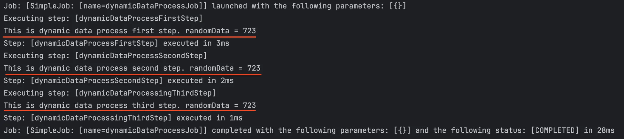각 Step에서 람다식의 chunkContext나 @Value를 통해서 주입된 JobExecutionContext의 동적 데이터를 꺼내서 사용할 수 있다.