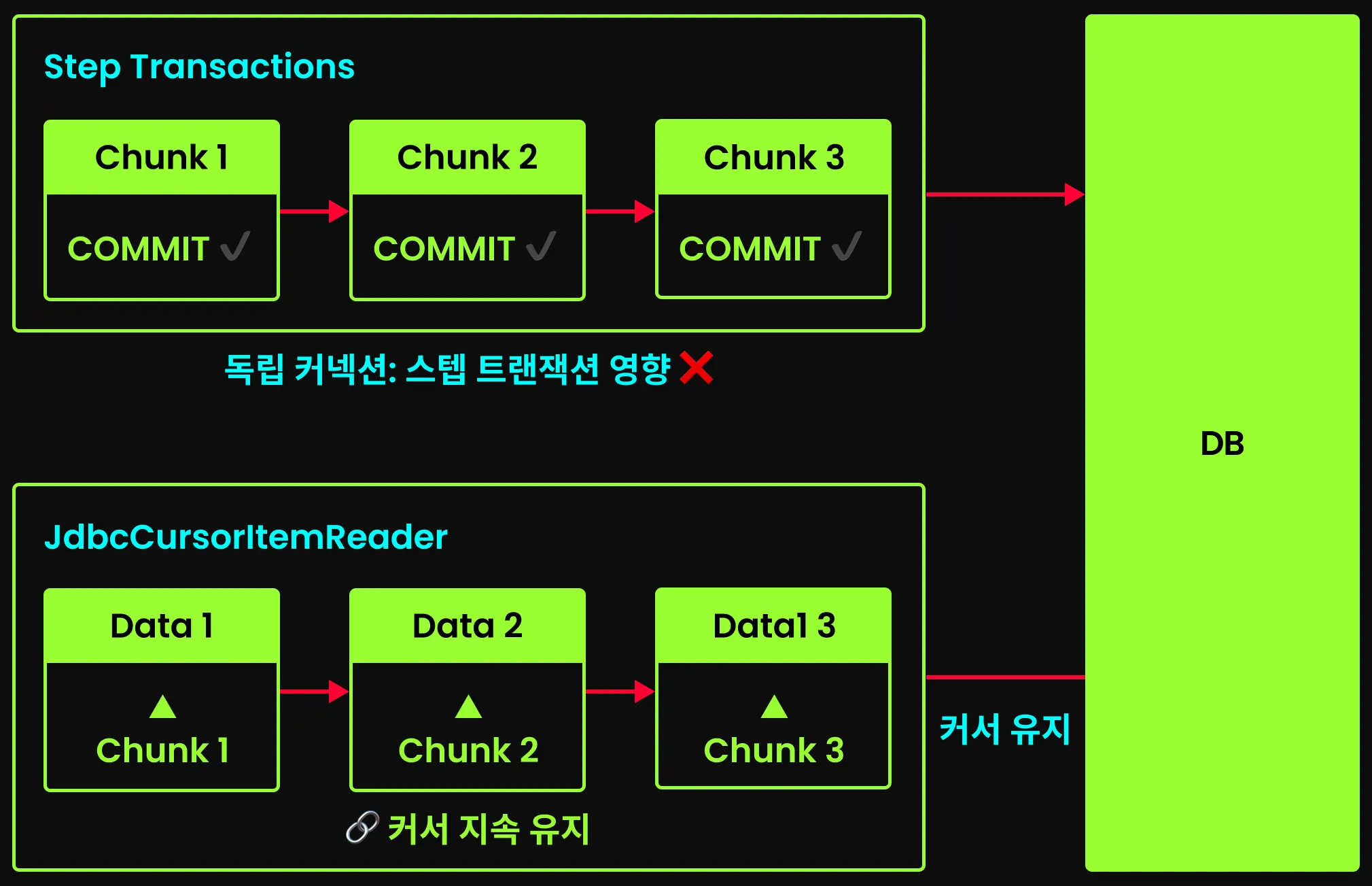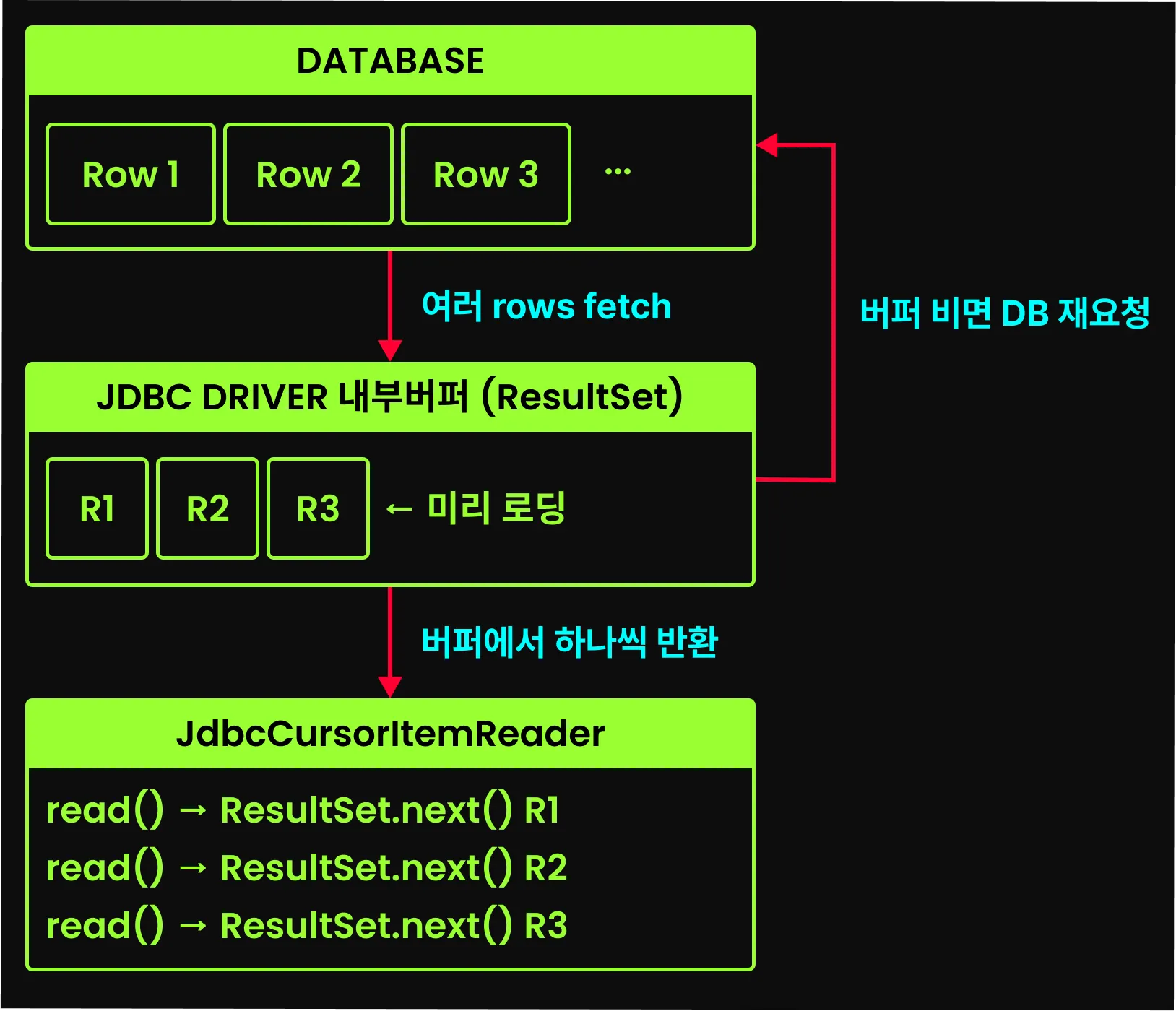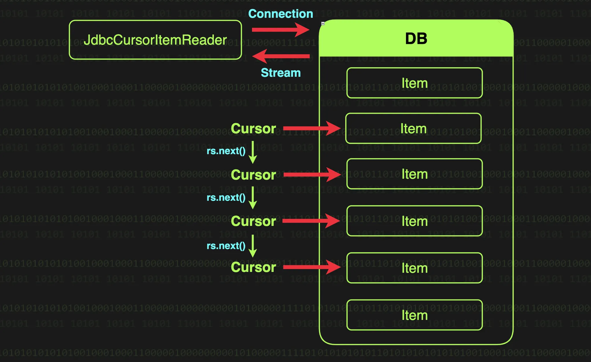 커서 기반 처리 방식은 데이터베이스와 연결을 유지한채로 데이터를 순차적으로 가져오는 방식이다. JdbcCursorItemReader가 초기화(open)될 때 지정된 SQL 쿼리를 실행하고, 그 결과를 가리키는 커서를 생성한다. 이후 read가 호출될 때마다 ResultSet.next()를 실행하여 한 행씩 데이터를 가져온다.