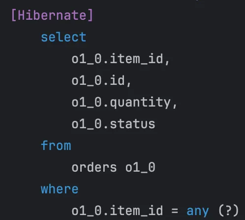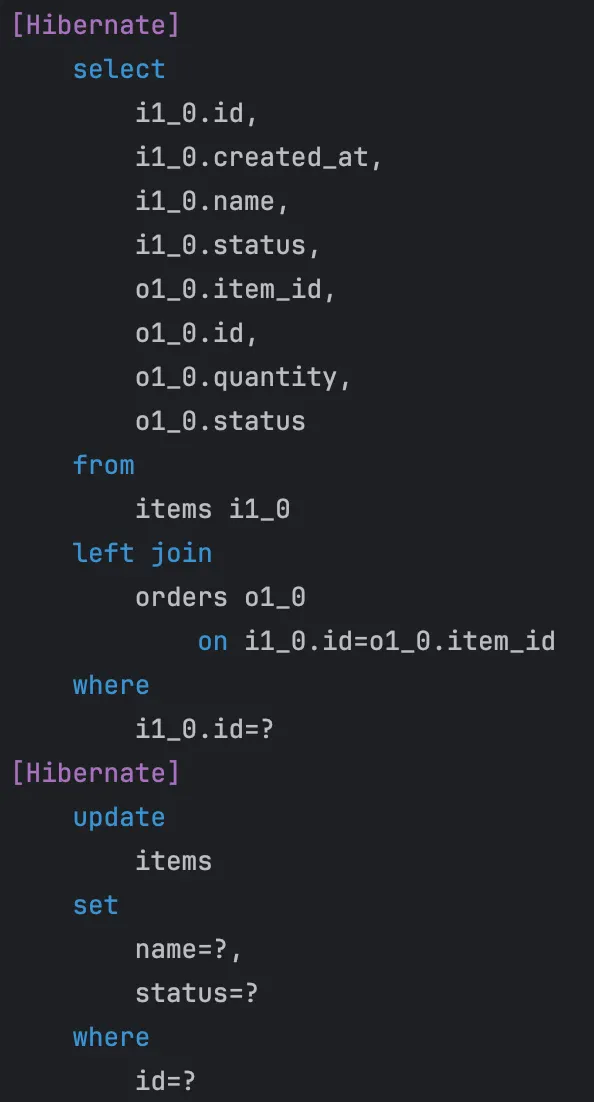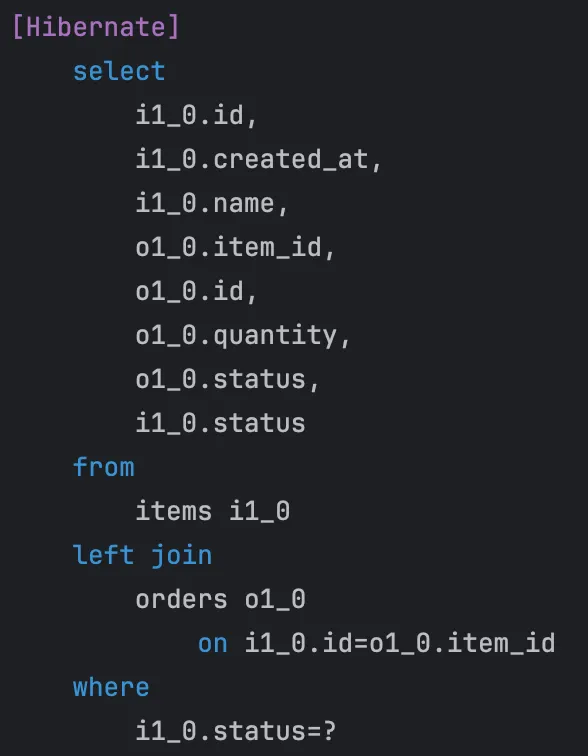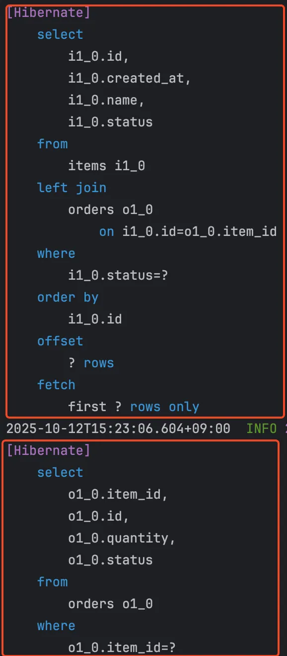 실제 쿼리를 실행시켜보면, items를 조회하는 쿼리에 left join이 포함되어 있지만 이후 orders를 단독으로 조회하는 N+1이 발생함을 알 수 있다.