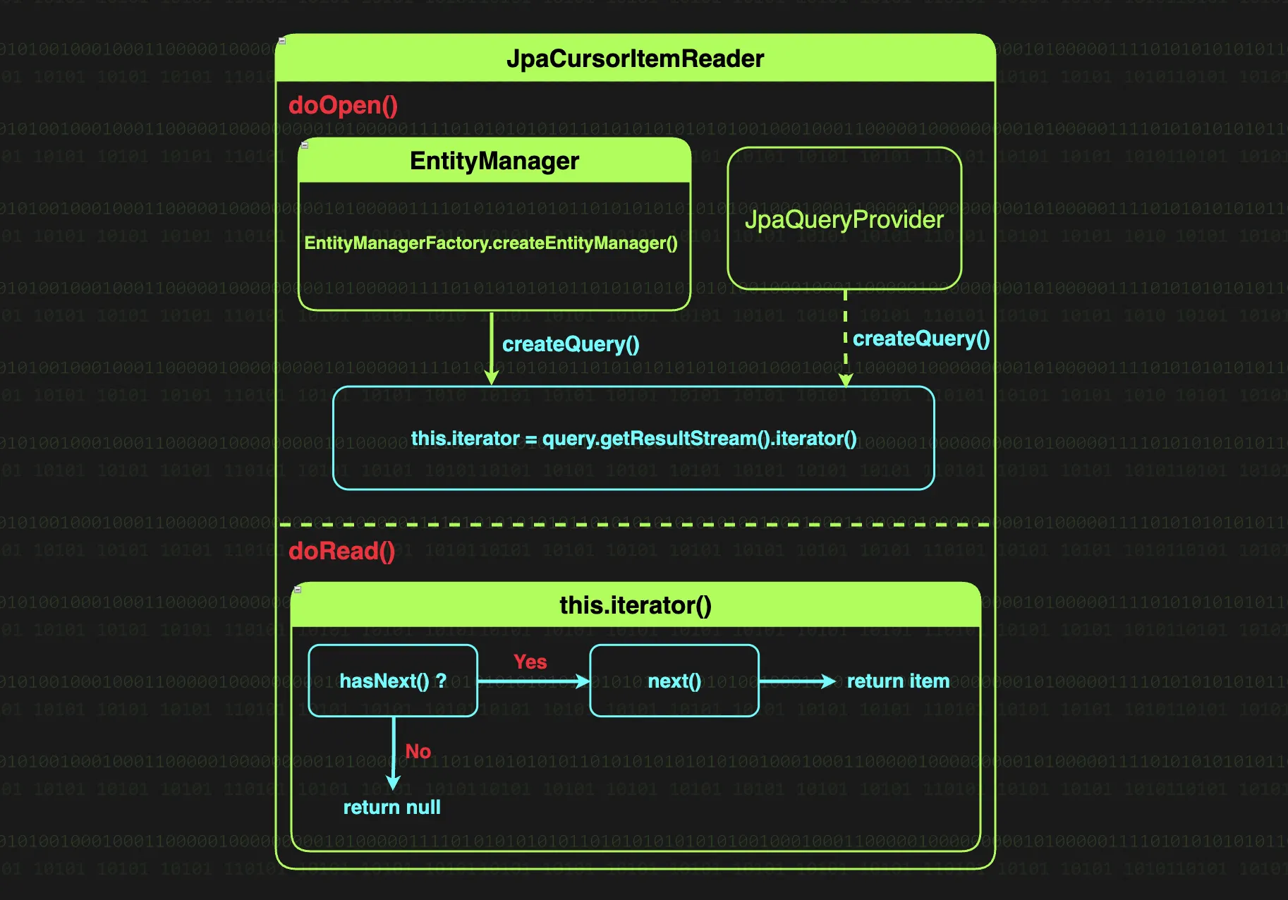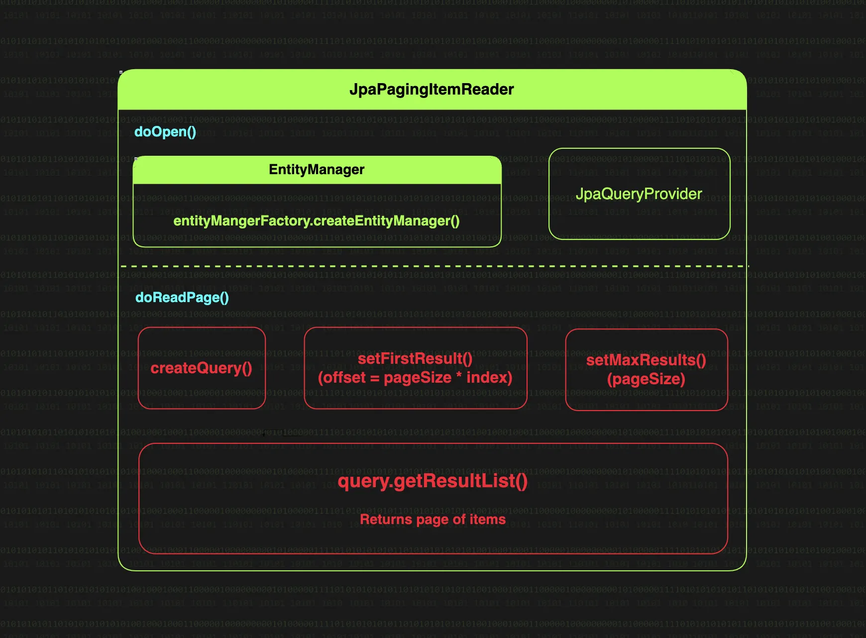 내부 컴포넌트만 보았을 때는 JpaCursorItemReader와 동일하고, JPQL query String 혹은 JpaQueryProvider를 통해 EntityManager로 실행 가능한 Query를 생성한다는 점에서 같다.