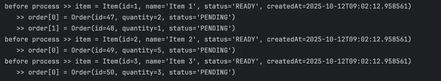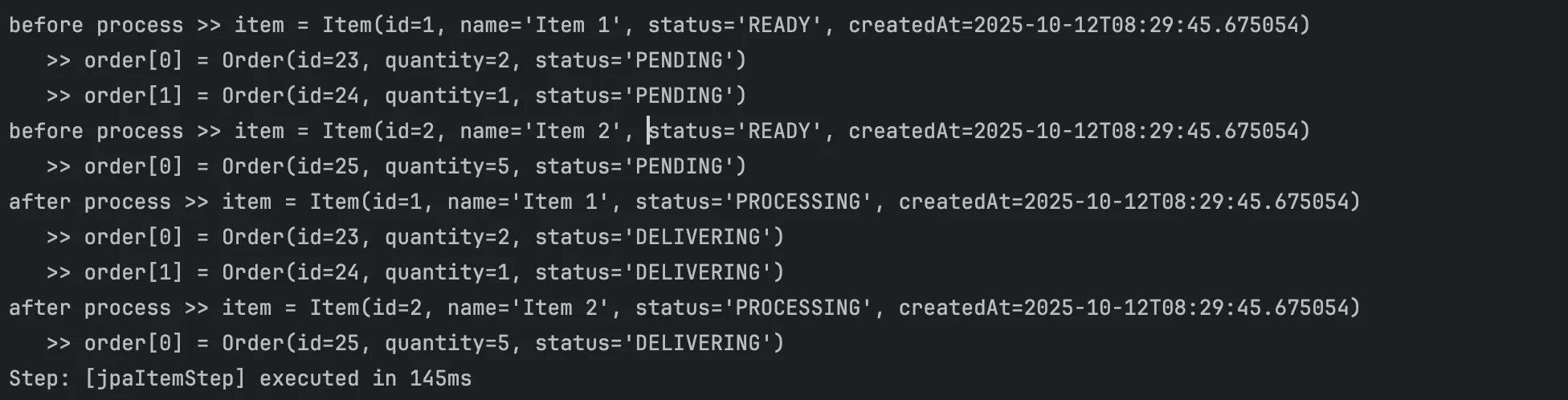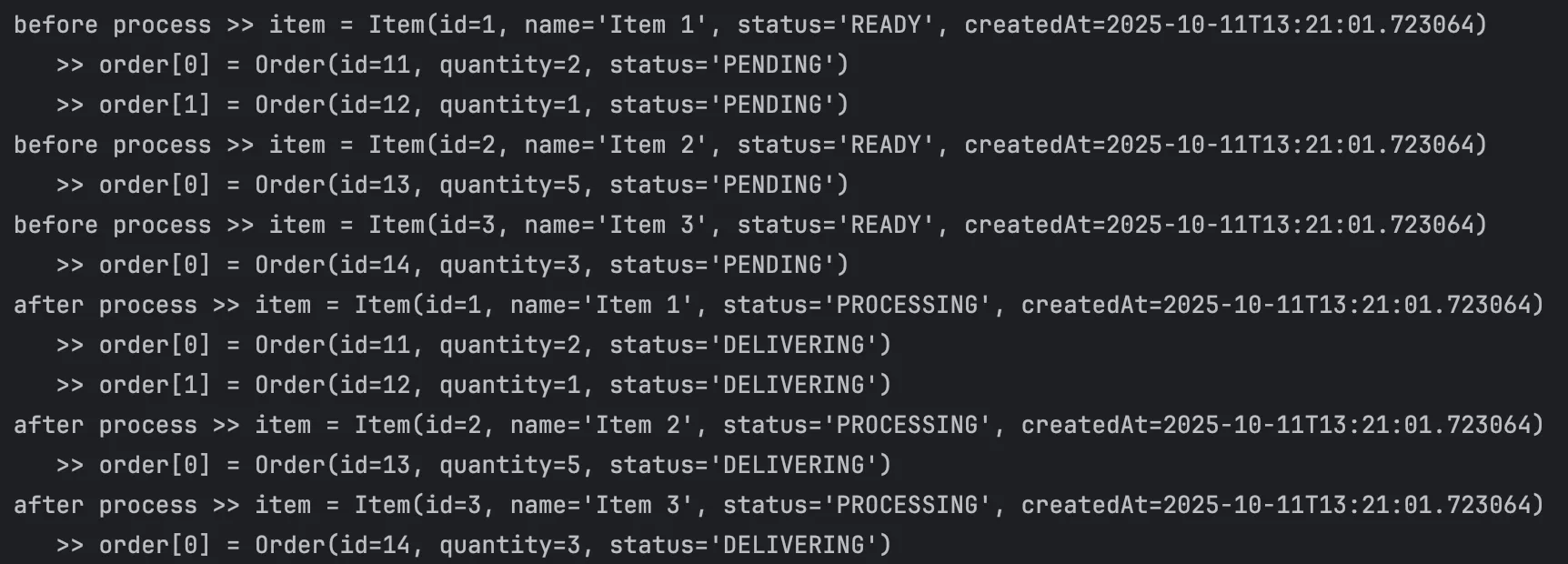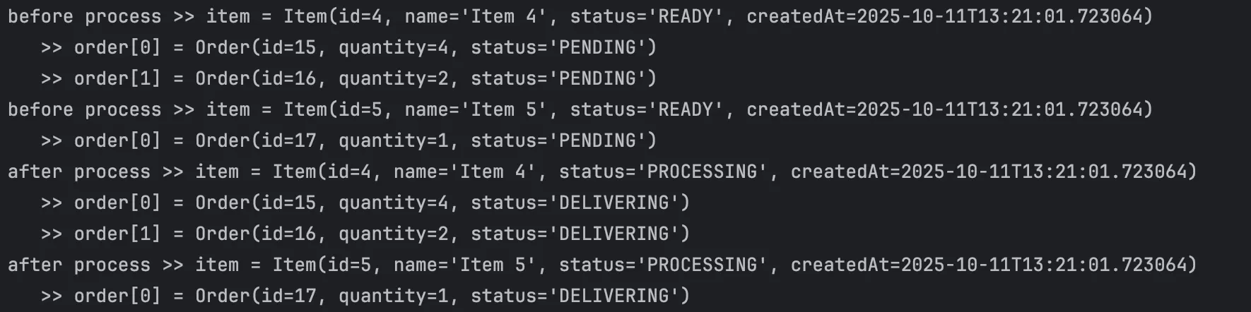 item의 status는 READY로, order의 status는 DELIVERING으로 전부 잘 변경되어 출력되는 것을 확인할 수 있다.