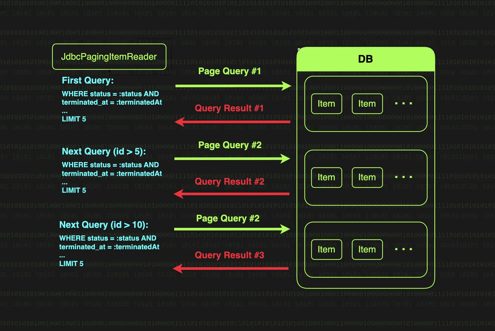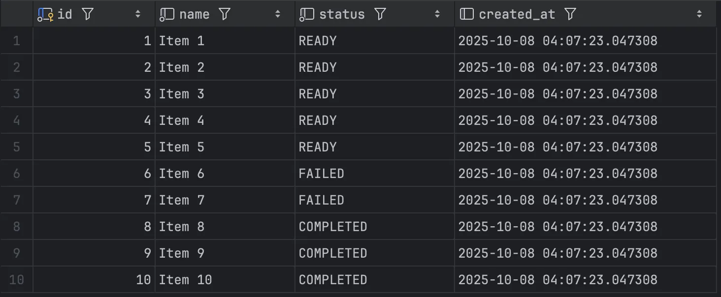 Paging 기반 처리 방식은 매 청크마다 페이징으로 쿼리를 새로 조회하기 때문에, 데이터의 실시간 변경에 취약하다. 위의 예시 코드를 보면 Item을 조회 후 Item의 status를 수정해 그대로 저장하는데, 조회 조건이 status이라 페이지 0을 처리하고 나면 기존의 페이지 정보가 달라지게된다.