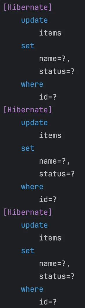 update 쿼리가 발생하는 것처럼 보인다. 하지만 Hibernate 로그는 단순히 쿼리가 어떻게 생성되는지만 보여줄 뿐이고, 실제로는 JdbcBatchUpdate로 쿼리가 처리되기 때문에 DB의 reWriteBatchInsert 설정이 true로 되어있다면 한 번의 쿼리만 발생한다.