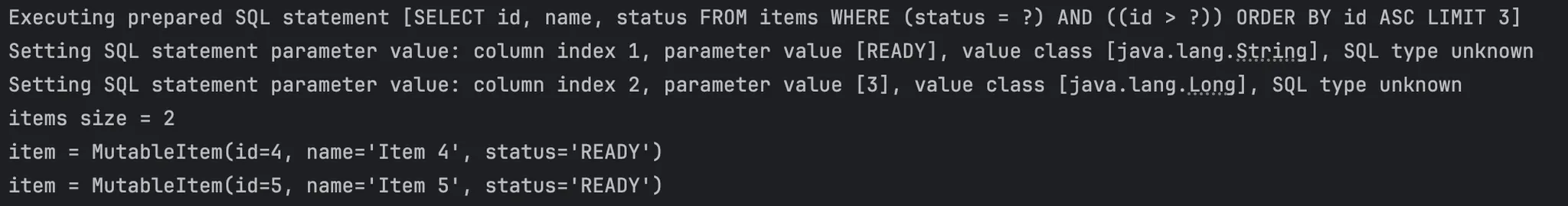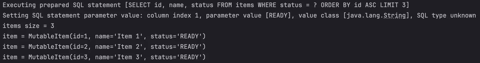 .sql("SELECT id, name, status FROM items WHERE status = ?")