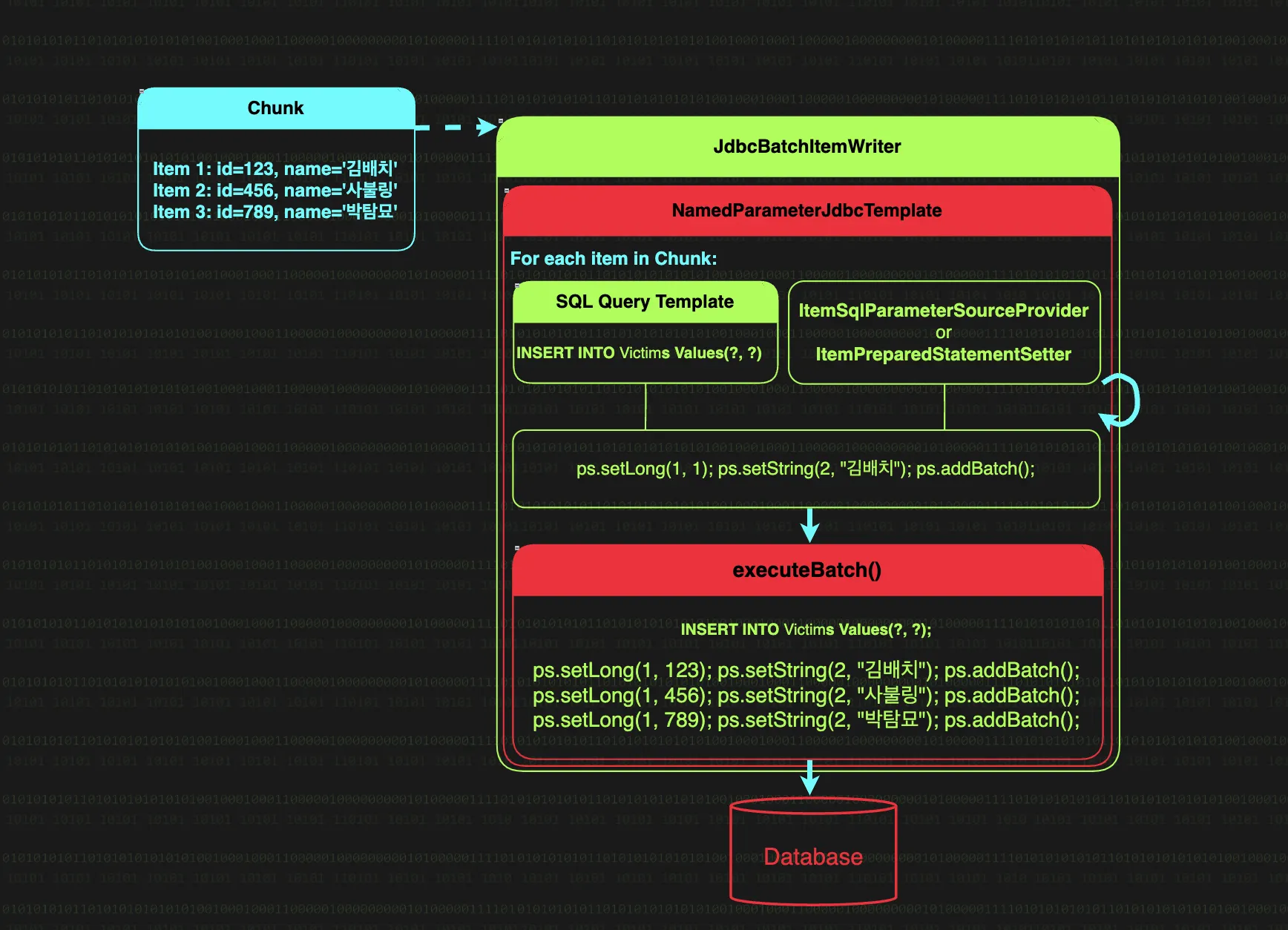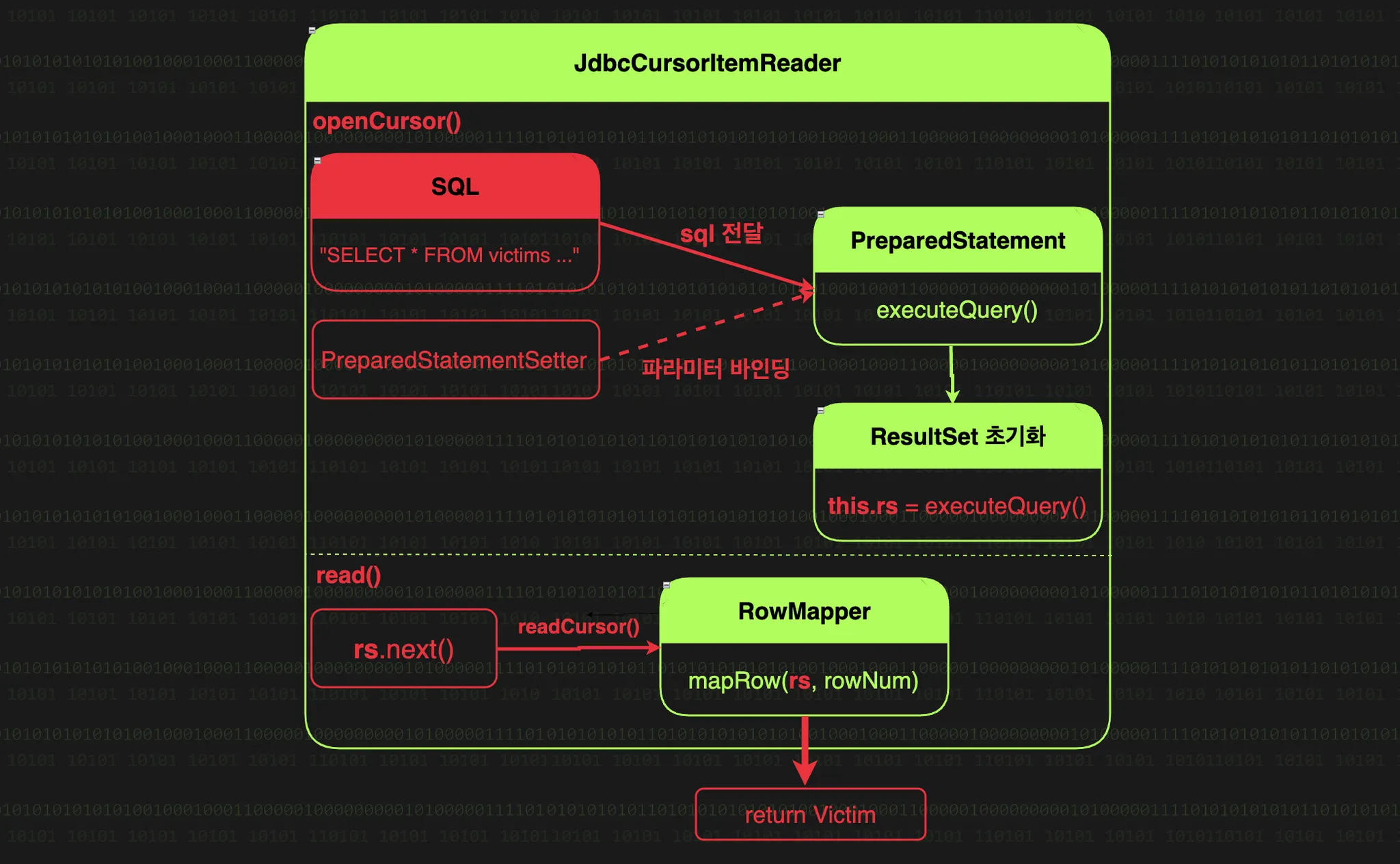 PreparedStatement(쿼리실행기) : PreparedStatement는 쿼리를 실행하고 결과를 ResultSet으로 가져오는 JDBC의 핵심 컴포넌트로, JdbcCursorItemReader는 Spring JDBC의 PreparedStatement를 통해 SQL을 실행한다.