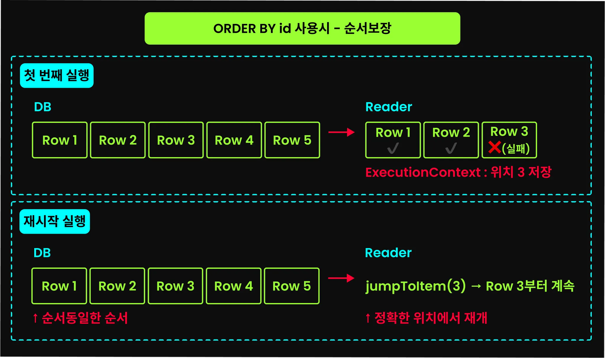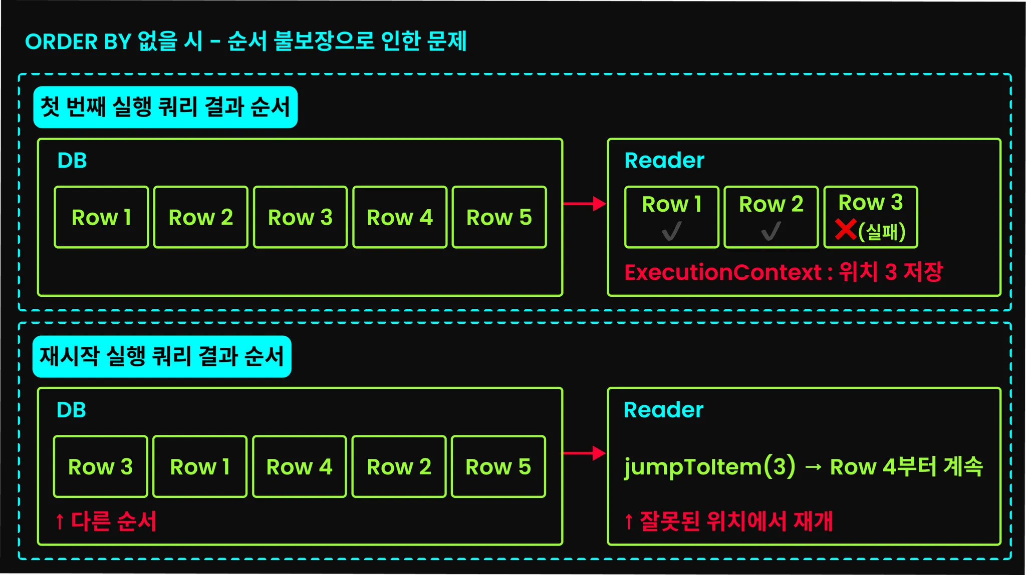 이전의 JdbcPagingItemReader나 JpaPagingItemReader 모두 동일하게, 페이징 기반의 ItemReader는 반드시 ORDER BY 절을 추가해야한다. 정렬 기준이 없다면 매 페이지를 읽을 때마다 데이터의 순서가 보장되지 않아 데이터가 누락되거나 중복될 수 있다.