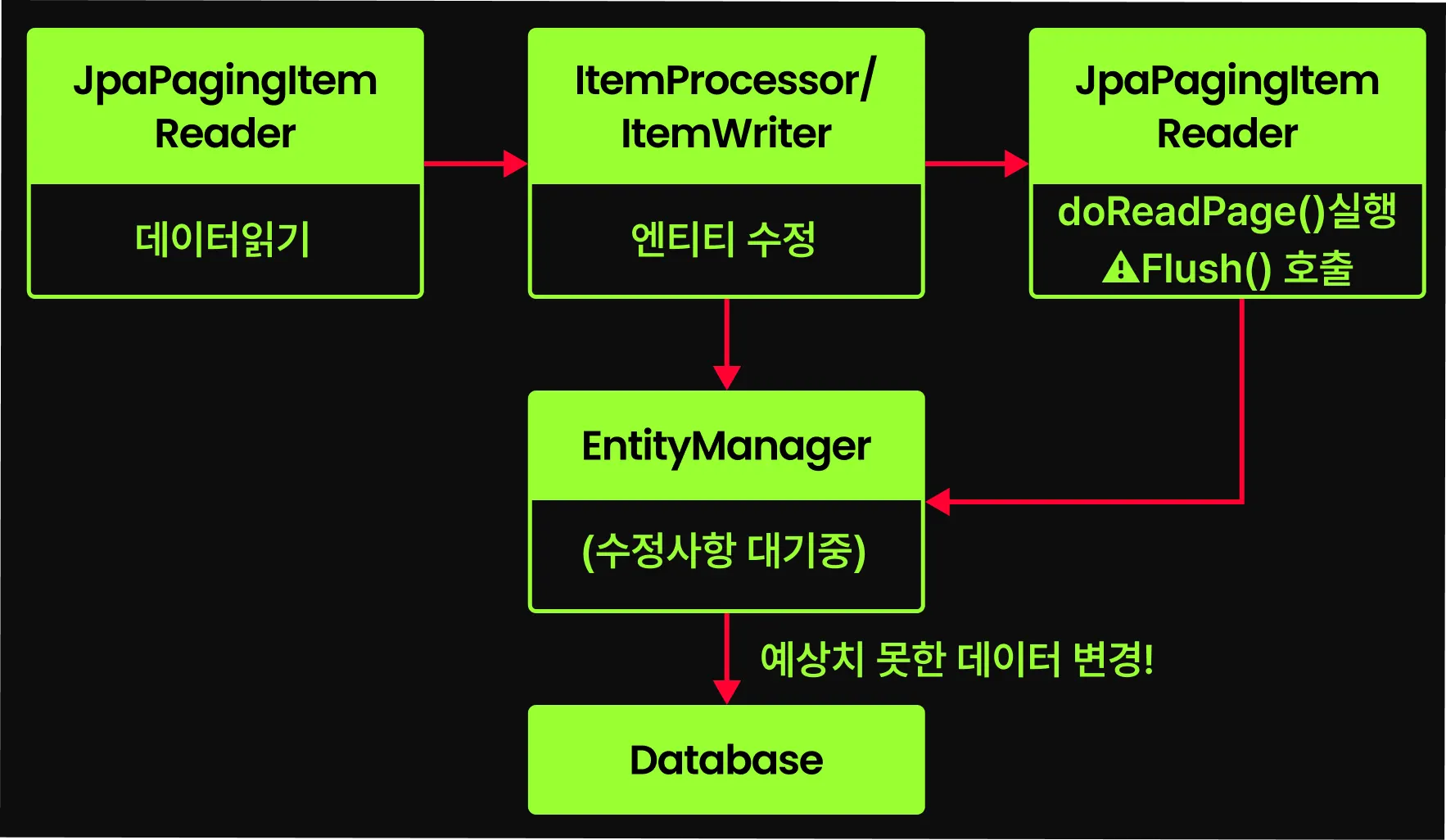 위에서 살펴본 내용에 따르면, JpaPagingItemReader에서 transacted 필드가 true인 경우 새로운 트랜잭션이 시작되어 관리된다. 하지만 이걸 true로 사용하는 경우 @BatchSize가 무효화 되는 것 외에도 또 다른 잠재적인 위험이 존재한다.