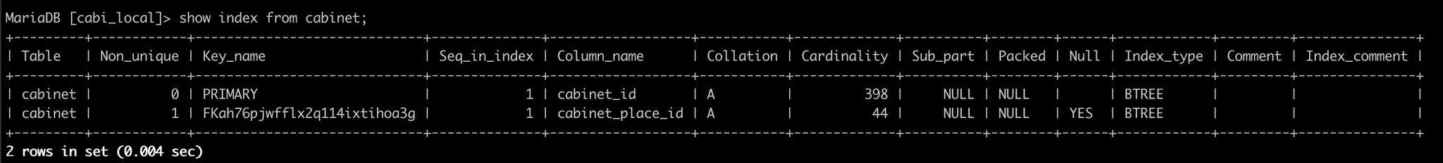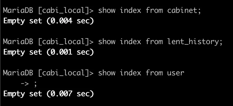 여기까지와서 생각을 해보니 내가 환경 세팅을 새로 한 이후, mariadb에서 직접 쿼리를 날려본 적이 없다는걸 깨달았다. 얼마전에 위의 저 쿼리가 왜 빨라진 건지 분석까지 했으면서, 인덱스를 확인해 볼 생각을 한 번을 안해보다니…