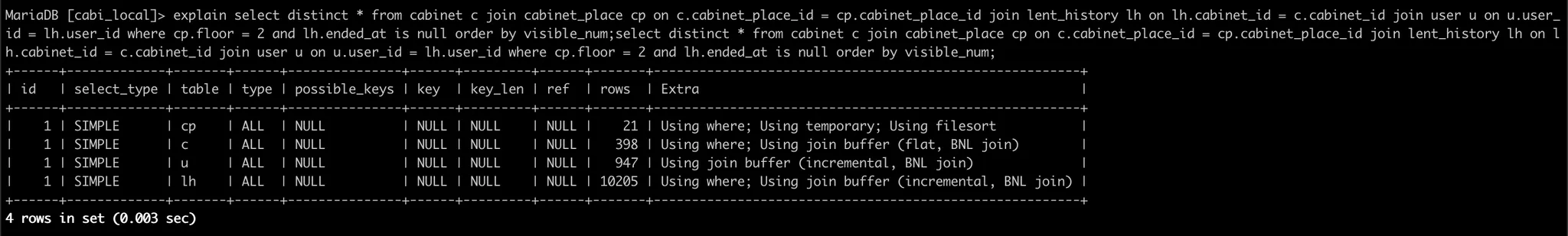 실행 계획을 확인해보니, 4개의 테이블 전부 풀 테이블 스캔이 사용된다.