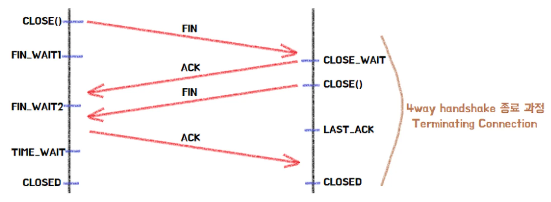 TCP 헤더의 코드 비트 필드에는 위와 같이 여러 플래그들이 들어있는데, 이를 이용해 통신 시작 시에 3-way handshake와 종료 시에 4-way handshake를 수행한다.