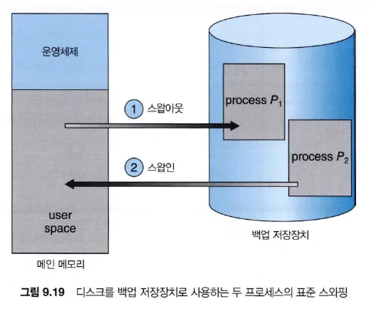 기본 스와핑은 메인 메모리와 백업 저장장치 간에 전체 프로세스를 이동시키며, 백업 저장 장치는 프로세스의 크기에 영향을 받지 않을만큼 충분히 커야한다.
