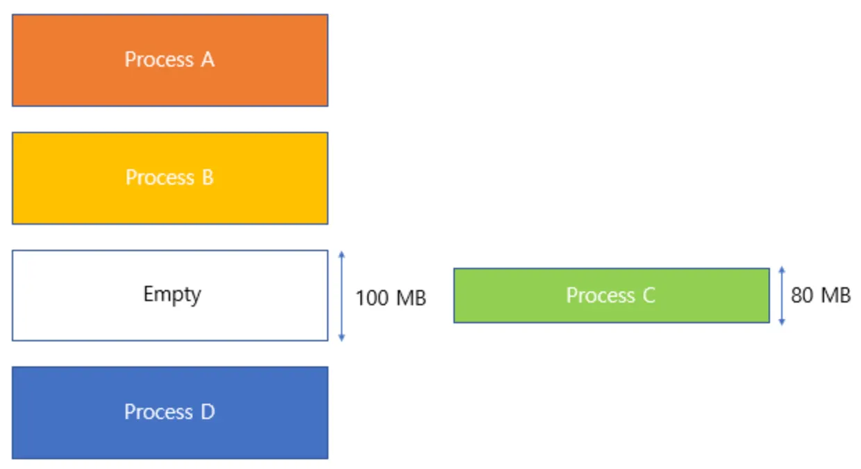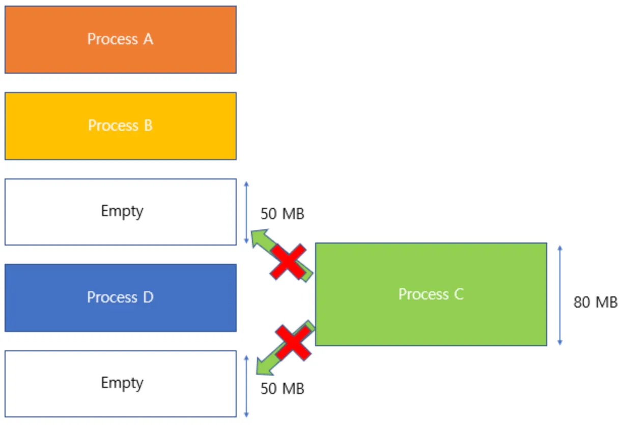 외부 단편화(external fragmentation)는 프로세스들이 메모리에 적재되고 제거되는 일이 반복되어, 너무 작은 가용 공간들이 많이 발생하여 이를 전부 합치면 충분한 공간이 되지만 분산되어 있어 사용하지 못하는 문제이다.