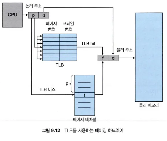 TLB는 key와 value로 구성되어 있는데, 페이지를 검색하면 key(페이지 번호)를 비교하여 매우 빠르게 검색한다. 페이지 번호가 TLB에 없다면(TLB miss), TLB에 페이지 번호(key)와 프레임 번호(value)를 새로 저장한다.