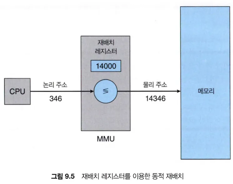 기준(base) 레지스터 기법을 일반화 시킨 단순한 MMU를 재배치(relocation) 레지스터라 부르는데, 주소가 메모리로 보내질 때마다 재배치 레지스터 속에 들어있는 값을 더해 물리 주소로 변환하는 방식이다.