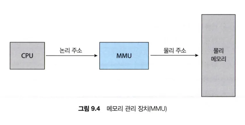 프로그램 실행 중에는 이런 가상 주소를 물리 주소로 바꾸어주기 위해 메모리 관리 장치(MMU, Memory Management Unit)이라는 하드웨어 장치가 사용된다.