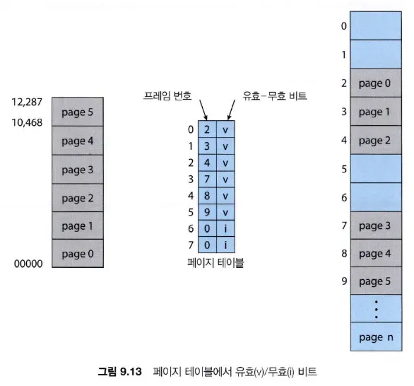 페이지 테이블의 각 엔트리에는 유효(valid)/무효(invalid)를 나타내는 비트가 존재하는데, 유효인 경우 페이지가 논리 주소에 잘 매핑되어 있음을 나타내며 무효인 경우 해당 페이지가 프로세스의 논리 주소 공간에 속하지 않는다는 것을 나타낸다.
