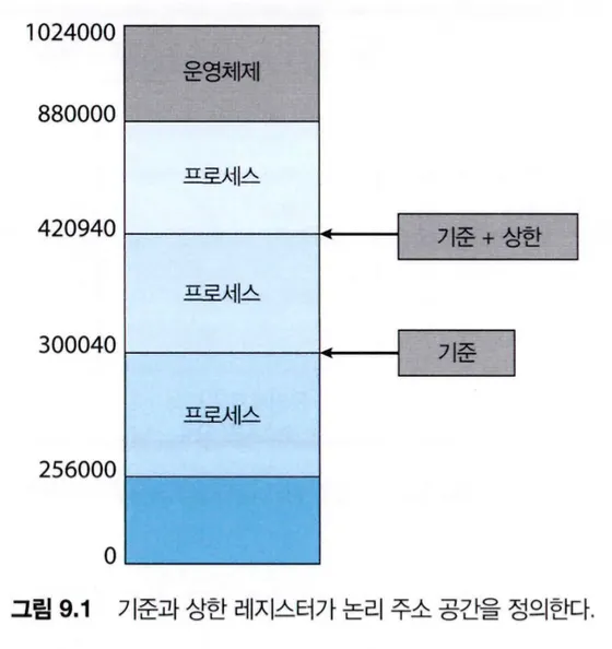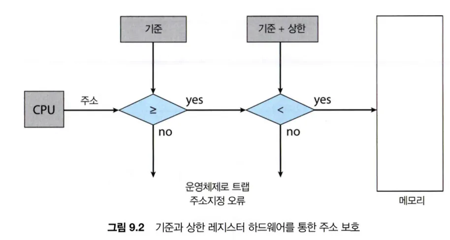 각각의 프로세스가 독립된 메모리 공간을 가지도록 기준(base) 레지스터와 상한(limit) 레지스터라는 두 개의 레지스터를 사용해 보호한다.