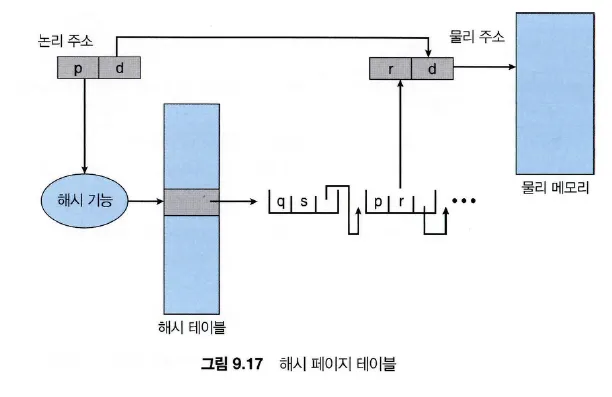 해시 페이지 테이블(hashed page tables)은 가상 주소 공간의 페이지 번호를 해싱하여 해시 페이지 테이블에 저장하는 방식이다. 테이블에서 충돌이 발생하는 부분은 연결 리스트를 통해 추가하고, 페이지를 검색할 때는 해당 연결 리스트를 순회하며 일치하는 가상 페이지 번호를 찾아 반환한다.