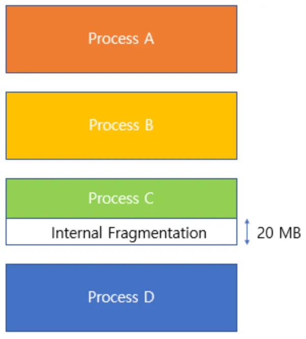 내부 단편화(internal fragmentation)는 메모리를 블럭 단위로 할당을 할 때, 블럭의 최소 단위로 인해 남는 메모리 조각이 발생하는 문제이다.