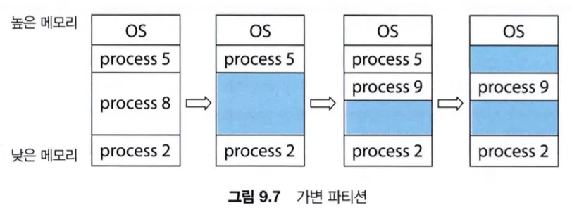 메모리를 할당하는 가장 간단한 방법 중 하나는 프로세스를 메모리의 가변 크기의 파티션에 할당하는 것이다. 이 방법을 가변 파티션 기법이라 하는데, 각 파티션에는 하나의 프로세스만 적재될 수 있다.