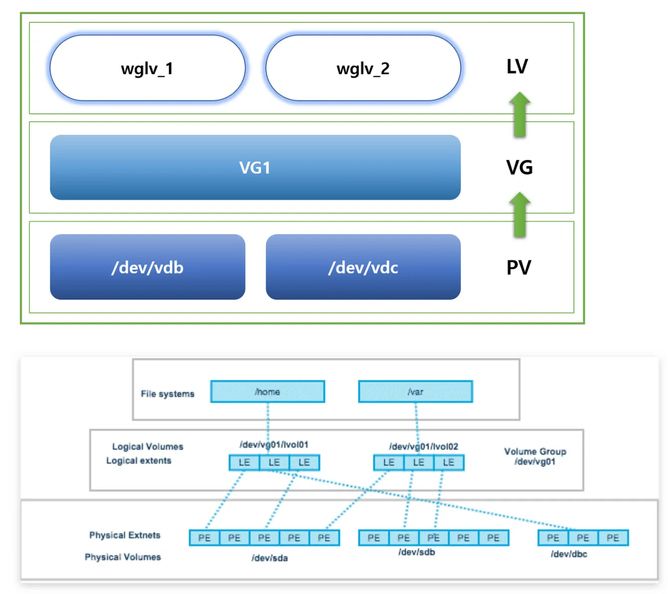PE (Physical Extent) : PV를 구성하는 일정한 크기의 Block으로, 1 PE는 4MB에 해당한다. PE는 LE와 1:1로 대응한다.
