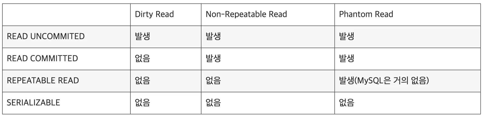 non-repeatable read : 여러 트랜잭션이 동시 발생했을 때, 이전 조회의 결과와 이후 조회의 결과가 다르게 보이는 현상