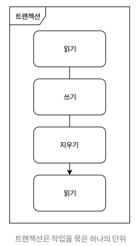 트랜잭션은 여러 작업들을 하나로 묶은 단위로, 이렇게 묶인 작업들은 모두 실행되거나 모두 실행되지 않는다(all-or-nothing). 읽기와 쓰기를 하나의 논리적 단위로 묶는 방법이라고 정의할 수 있다.